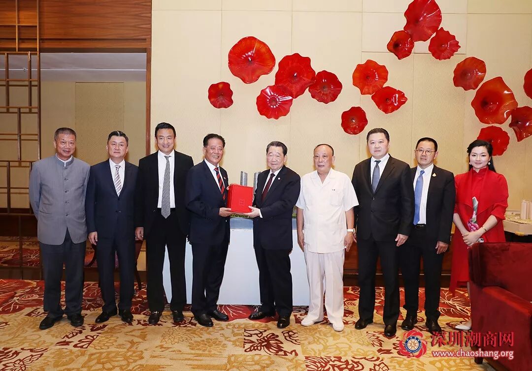郑汉明会长(左四)代表深圳市潮汕商会向正大集团资深董事长谢国民(右五)赠送纪念品