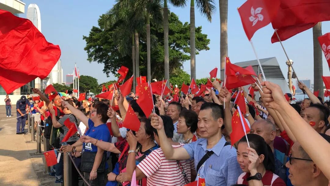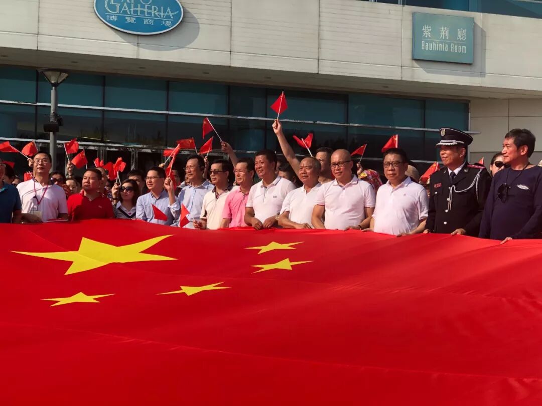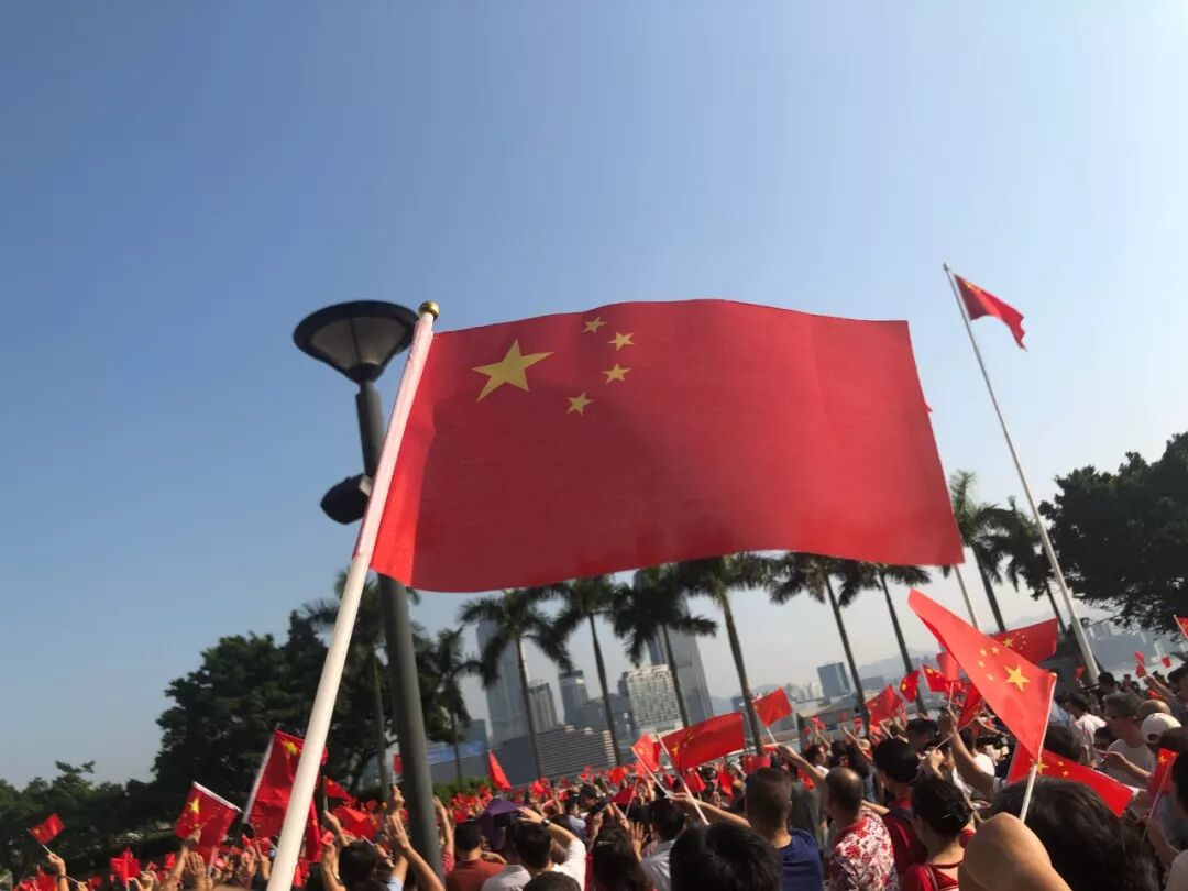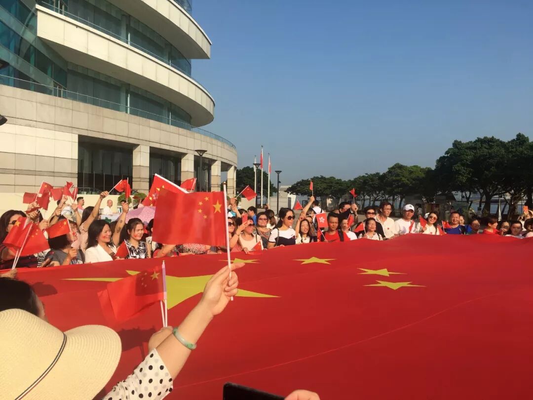 仪式过后,大伙儿簇拥在一面30多平方米的巨幅五星红旗周围,金紫荆广场成了红色的海洋!