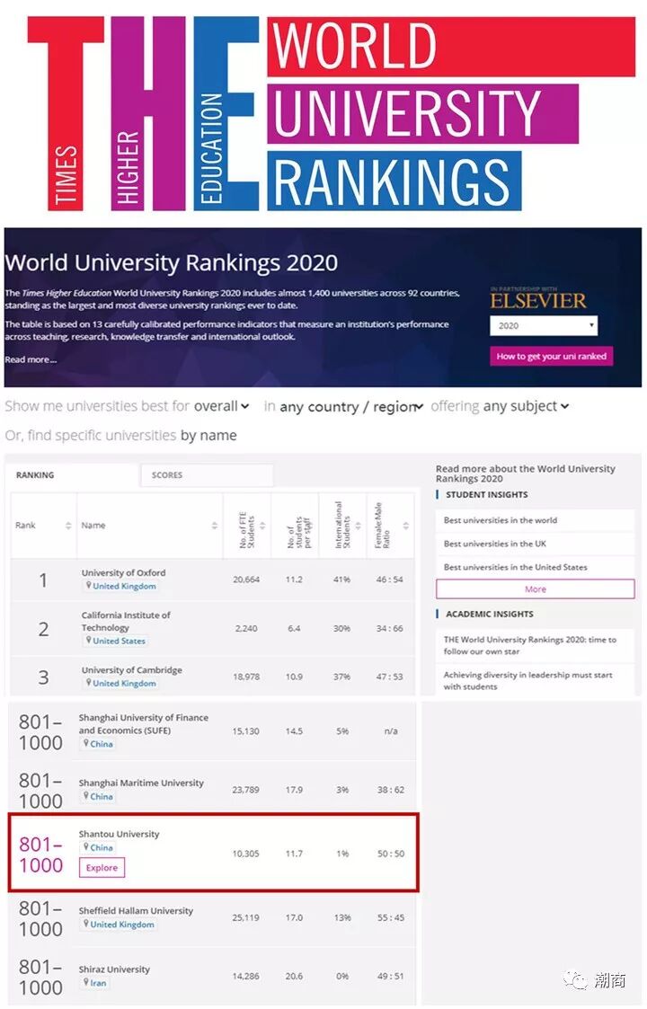 提示:点击上方"潮商"关注我们 北京时间2019年9月11日凌晨,2020年泰晤士高等教育世界大学排名公布,汕头大学位列全球801-1000位,在上榜的81所中国内地高校中并列第43位,据悉,这是汕头大学自2016年首次进入该榜单以来的第五次上榜。 ![]() ![]() 《泰晤士高等教育》(简称:Times Higher或THE),原名《泰晤士高等教育增刊》(简称:The Times Higher或The THES),是一份英国出版的高等教育报刊,是公认的四大权威大学世界排名之一。该排名每年更新一次,以教学、研究、论文引用、国际化、产业收入等5个范畴共计13个指标,为全世界最好的1000余所大学(涉及近90个国家和地区)排列名次,其排名结果对各国高等教育发展有广泛影响。 近年来,汕头大学国际化办学水平与影响力日益提升,在世界主要大学排行榜中,综合排名显著提升。为深化教育改革探索,进一步发挥汕头大学作为教育部、广东省、李嘉诚基金会三方共建大学在高等教育改革中的示范作用,李嘉诚基金会从今年起推出一项教育资助创举,支持汕头大学成为国内第一所全日制本科生学费全额奖励的公立综合性大学。首期奖励计划的对象为2019级至2022级本科生,包括四年制专业和临床医学、口腔医学等五年制专业。主要奖励支持这四个年级的汕大本科学生在校修读完成本科所有课程。每年的捐资额度依据2019级至2022级本科生当年的学费总额,并以每年一亿元人民币为资助上限。据悉,汕头大学今年共录取新生4364名,其中,博士研究生65名、硕士研究生1173名,本科生3126名。 来源:汕头政务发布 声明:本文不代表我们的观点,仅供读者参考。文章版权归原作者所有,如有侵权,请联系我们进行删除。 潮 商 文化的境界 · 财富的智慧