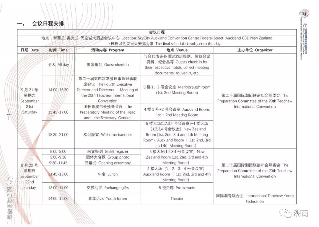 提示:点击上方"潮商"关注我们 ![]() 国际潮团联谊年会是国际潮团总会最主要的活动之一。国际潮团总会于1980年春夏由东南亚潮团倡议成立,是集潮商最高人脉及众多泰斗级人物的国际组织。国际潮团联谊年会于1981年创办,每隔两年举行一次,至今已历十九届,举办过该年会的城市有:香港、曼谷、吉隆坡、新加坡、澳门、巴黎、圣荷西、汕头、芭提雅、北京、广州、悉尼、武汉、温哥华、雅加达。 ![]() 1981年,首届国际潮团联谊年会在香港举办 长久以来,潮人超强的血缘亲情、乡土观念和勤劳智慧让世人惊叹,一句“胶己人”将潮汕人的团结之情展露得淋漓尽致。 潮人的海外移民史是一部惨烈的血泪史,也是一部壮丽的拼搏史。几百年过去,在海外的侨胞或已传承了十代、二十代,“海内一潮汕,海外一潮汕”,在海外的潮人总数已达一千多万,但他们的情怀从没改变!他们按照潮汕人的方式坚守着独特的文化传统。于是,才有了遍布世界各地的潮州会馆,才有了数不胜数的潮人社团,才有了已举办多届仍延续至今的国际潮团联谊年会。 国际潮团联谊年会作为一场国际性盛会,对于全球潮人敦睦乡谊,加强经济文化交流,促进中国和海外潮人所在地区经济贸易的发展,提高海外潮人及华人的地位,都起着重要作用,也为东西方文化交流融合及经济交流架起了一道金桥。 与此同时,主办国际潮团联谊年会也成为各地潮商会提升影响力的重要契机。在2017年于雅加达举办的第19届国际潮团联谊年会上,新西兰潮属总会主席张乙坤从第19届年会主席曾国奎手中接过了国际潮团总会会旗,正式宣布第20届年会将于2019年在美丽的千帆之都——新西兰奥克兰举办。 ![]() 2017年10月,在第19届国际潮团联谊年会闭幕式上,正式宣布第20届年会将于2019年在美丽的千帆之都——新西兰奥克兰举办 ![]() 第20届年会的主题是:潮起千帆,笃行致远。寓意潮汕儿女相聚千帆之国新西兰,一代弄潮儿英才豪杰在此尽领风骚。具有创业创新精神的潮商,守信念,胸怀梦想,在诗与远方的地方,跨上伟大新征程。 第20届国际潮团联谊年会张乙坤主席预告专访 新西兰驻印尼大使对潮人印象 抵达新西兰参加本次年会接机现场 第20届国际潮团联谊年会议程 ![]() ![]() 声明:本文不代表我们的观点,仅供读者参考。文章版权归原作者所有,如有侵权,请联系我们进行删除。 潮 商 文化的境界 · 财富的智慧
