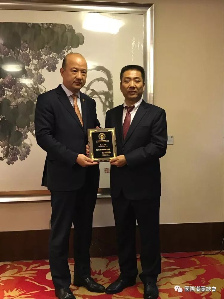 国际潮团总会张乙坤主席庄重聘请洪江游会长为第二十届国际潮团联谊年会筹备委员会荣誉主席