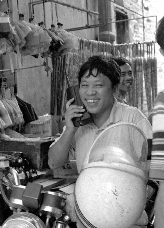 1994年,广东个体经济蓬勃发展,在繁华的商业街市上,常见骑摩托的个体户手持“大哥大”做生意。图为广州街头用“大哥大”打电话的商人。(新华网)
