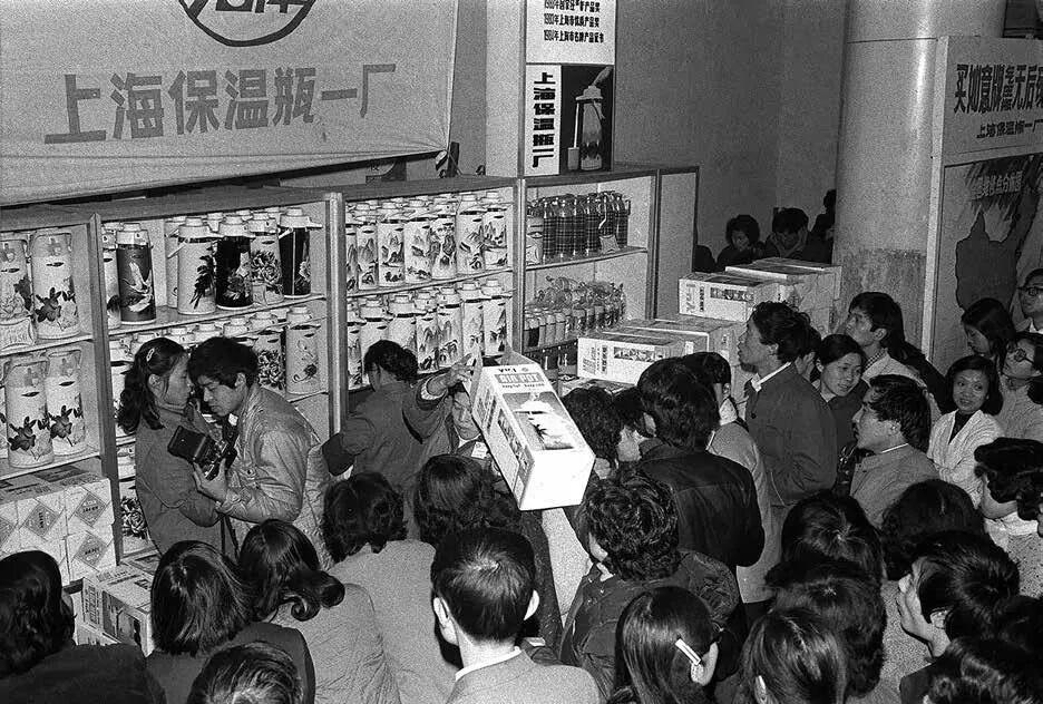20世纪80年代末期至90年代初,开始流行一种具有保温功能的压力暖水瓶。那时的上海,结婚时女方家里的嫁妆中若有压力暖水瓶,则证明这家的经济条件很好。图为1989年,上海第一百货商店柜台前挤满了抢购新式暖水瓶的人。