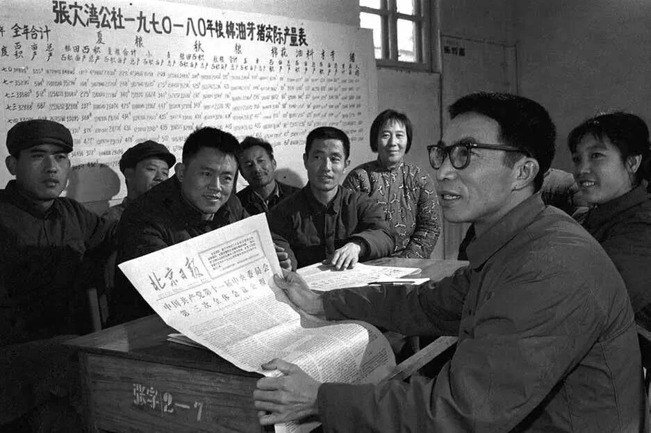 1978年12月,中共十一届三中全会在北京召开。图为12月24日,北京市通县张家湾公社的干部和社员认真学习党的十一届三中全会公报。