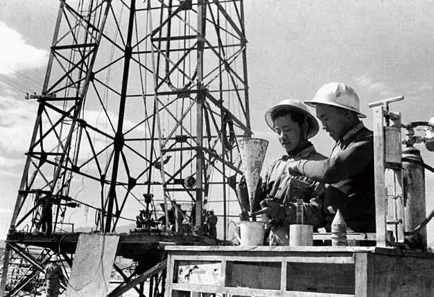 1957年10月8日,中国第一个天然石油基地——玉门油矿基本建成。图为两位工人在分析泥浆,了解玉门油矿新油井钻探情况。