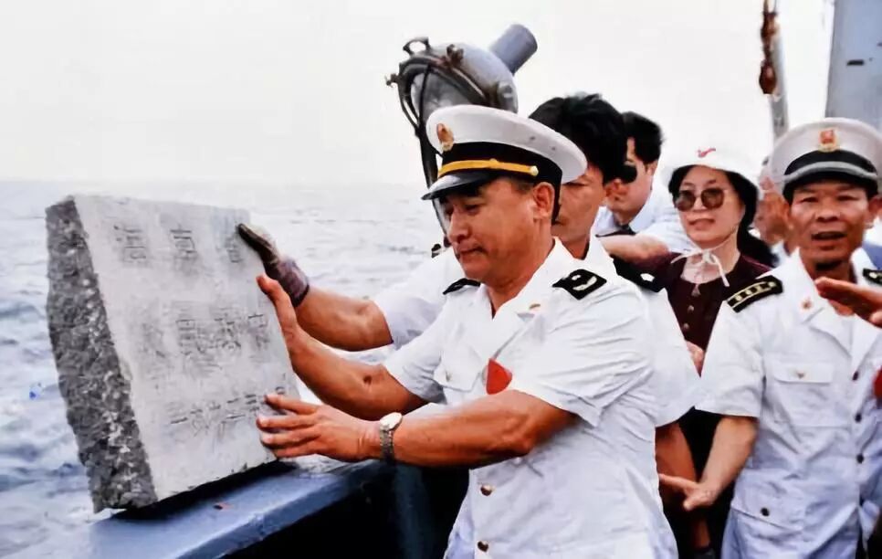 1992年1月,海南省组成以省政府主要领导和当地驻军首长为首的巡视慰问团,历时近半个月,远航南沙群岛,宣示主权、慰问我戍边将士。图为1月15日,海南某海军基地副政委刘卫东少将在曾母暗沙投放主权碑。(新华社/姜恩宇)