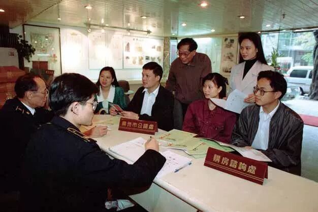 1998年7月3日,国务院发出《关于进一步深化城镇住房制度改革加快住房建设的通知》,提出从1998年下半年开始,全国城镇停止住房实物分配,逐步实行住房分配货币化。图为广州购房者在中介公司办理购房手续。