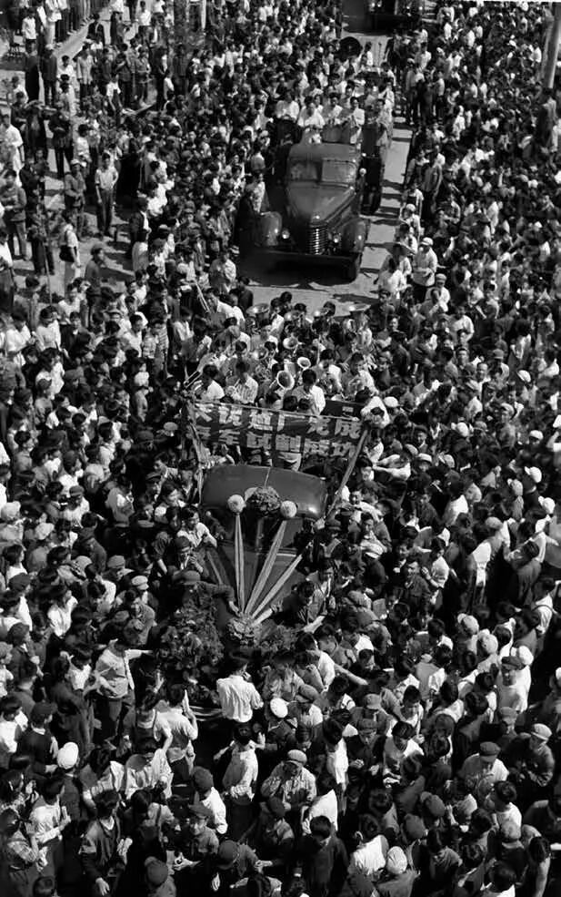 1956年7月15日,长春第一汽车制造厂生产出中国第一辆解放牌汽车。解放牌汽车的问世,结束了我国不能生产汽车的历史。图为第一批国产解放牌载重汽车排成长列开出长春第一汽车制造厂的时候,全厂职工夹道欢呼。