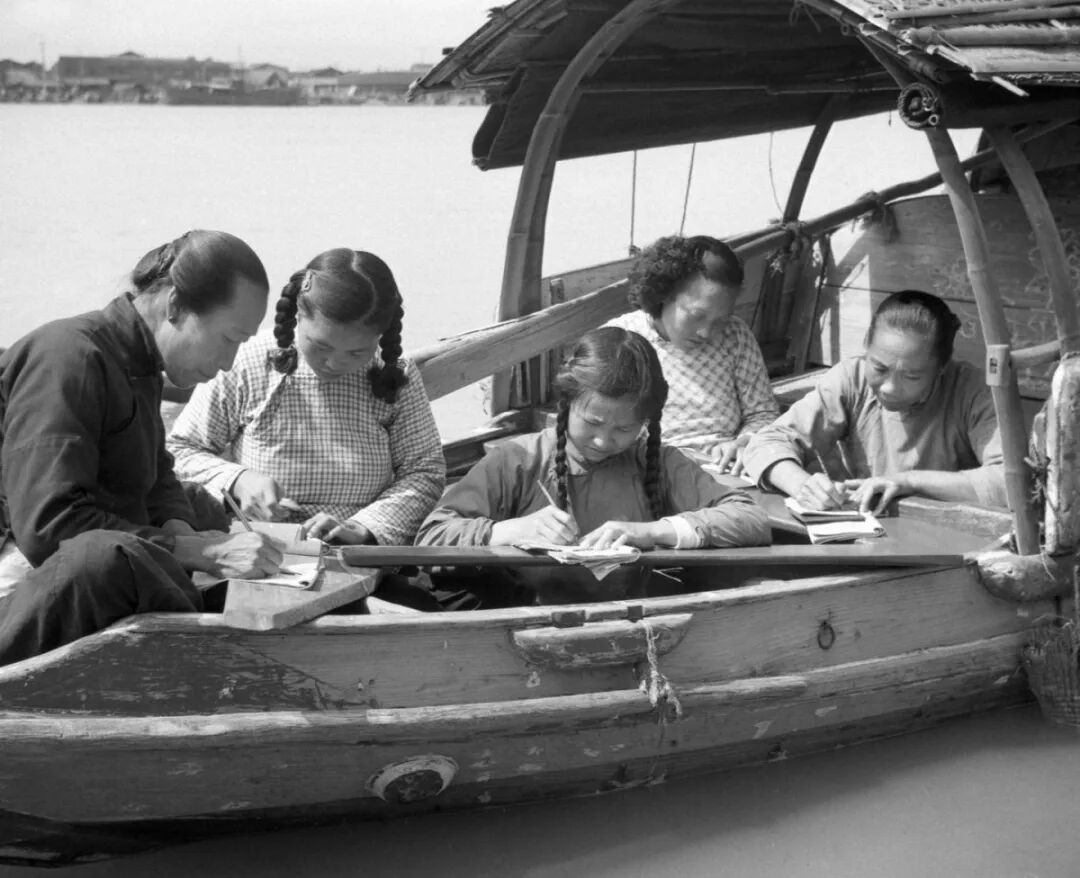 1958年,福建省福州市生活在水上的妇女在船头练习写字。解放前,福州市的水上居民中妇女100%都是文盲,解放后,她们组织了识字班,在当地小学教师的辅导下开展扫盲学习。(新华社)