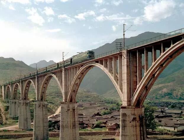 1975年7月1日,中国第一条电气化铁路——宝成铁路建成通车,全长676公里。图为中国自制的“韶山”型电力机车牵引着客车行驶在宝成铁路上。