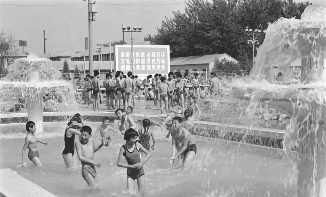 1983年暑假,北京高温,学生们来到陶然亭游泳场愉快地嬉水、游泳。(新华社/黄景达)