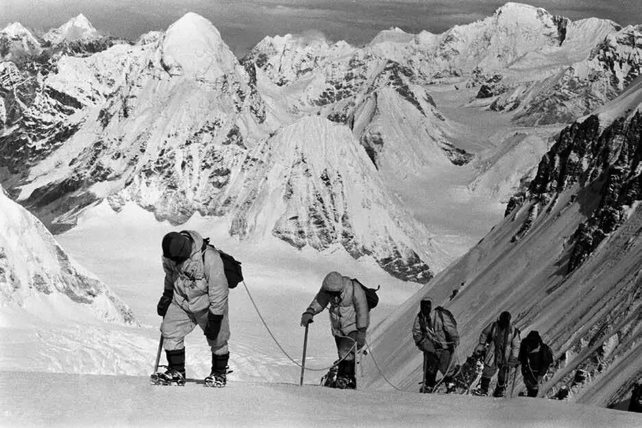 1960年5月25日清晨4点20分,中国登山队队员王富洲、贡布(藏族)、屈银华胜利登上了珠穆朗玛峰,这是人类历史上第一次从北坡登上世界第一高峰。图为我国登山队队员在海拔7150米的冰雪坡上行军。