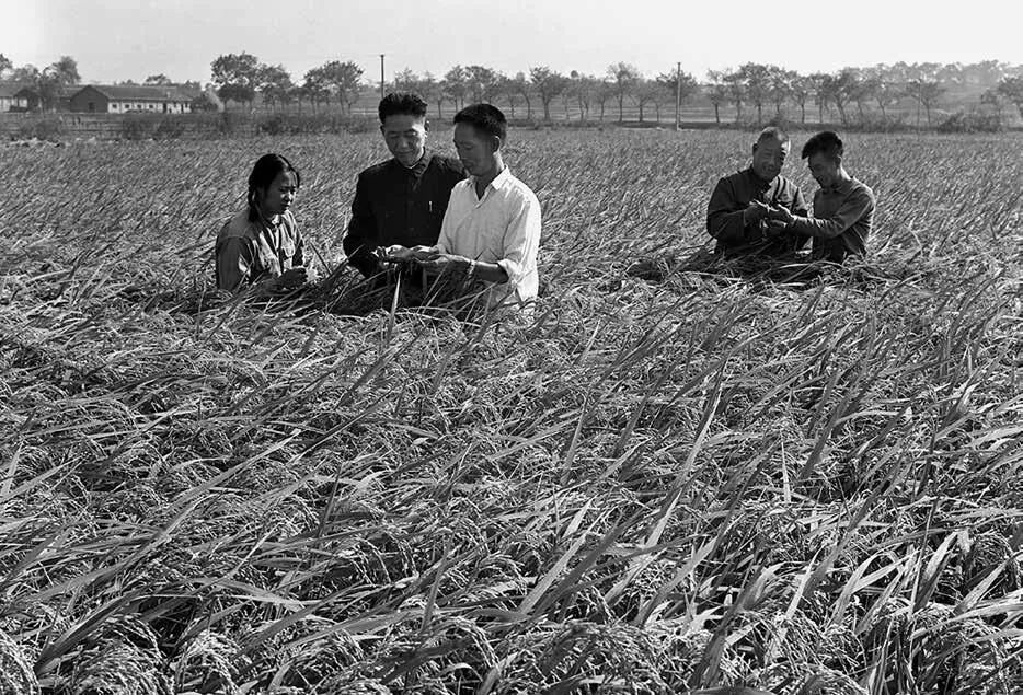 1973年10月,在全国水稻科研会议上,袁隆平发表了《利用“野稗”选育“三系”的进展》一文,正式宣告中国籼型杂交水稻“三系”配套成功。自此,袁隆平率领科研团队,在数年时间内解决了十多亿人的吃饭问题。图为袁隆平(右三)在观察杂交水稻生长情况。