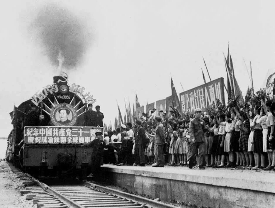 1952年6月13日,新中国成立后修建的第一条铁路干线——成渝铁路竣工,7月1日正式通车。图为7月2日,自重庆开出的第一列火车到达成都时受到群众的热烈欢迎。