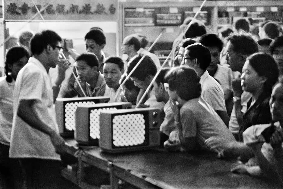 随着改革开放的不断深入,人们的生活发生了翻天覆地的变化。到了20世纪80年代,当年的老三大件已被电视机、冰箱、洗衣机取代。图为1981年,北京西单商场,群众抢购电视机。