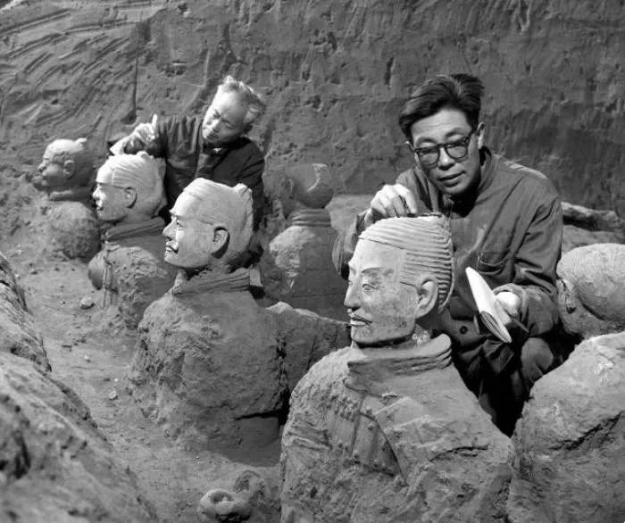 1974年,秦始皇陵兵马俑在陕西临潼县西杨村被发现,此后挖掘工作陆续展开。图为1979年7月11日,考古工作者在仔细发掘清理陶俑。(新华社/安克仁)