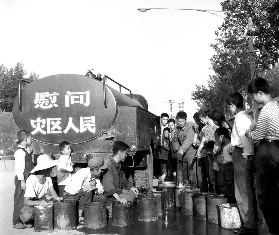 大地震使唐山全城水电瘫痪。图为1976年8月1日,解放军及时派出给水车为灾民们送水。(新华社/王建民)