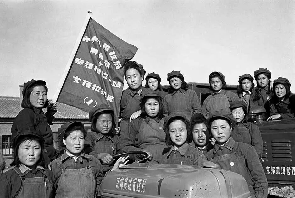 自从新中国第一个女拖拉机手——梁军出现后,许多年轻女性便渴望成为拖拉机手。农业部在双桥成立了机耕学校,有计划地吸收农村妇女参加学习。图为1951年3月,正在实习中的农业部京郊拖拉机站的第一批女拖拉机队队员合影。
