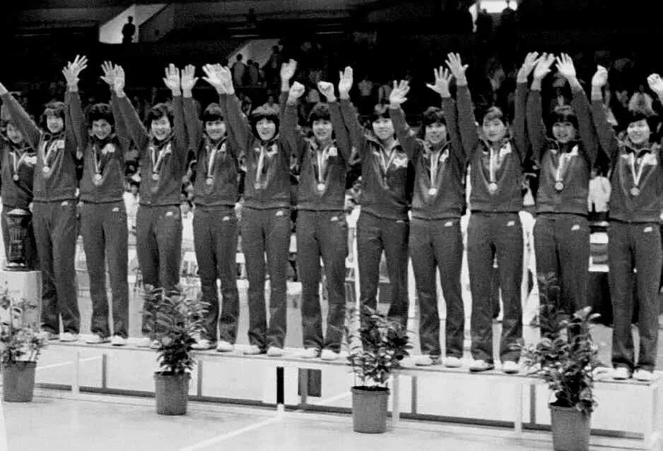 1986年9月13日,中国女子排球队在布拉格举行的第10届世界女子排球锦标赛上,以3比1战胜古巴队,成为第一支在世界女子排球大赛中获得五连冠的球队。中国女排完美地诠释了“女排精神”,激励和鼓舞了一代又一代人。图为中国女排队员在领奖台上向观众致意。
