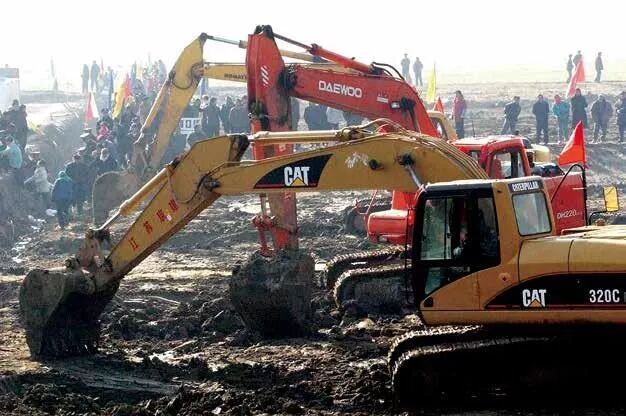 “南水北调工程”主要解决我国北方地区,尤其是黄淮海流域的水资源短缺问题,规划区人口4.38亿人。2002年12月27日,南水北调工程东线工程正式启动。图为江苏扬州宝应县,巨型铲挖机在“南水北调”东线工程潼河工地上投入施工。