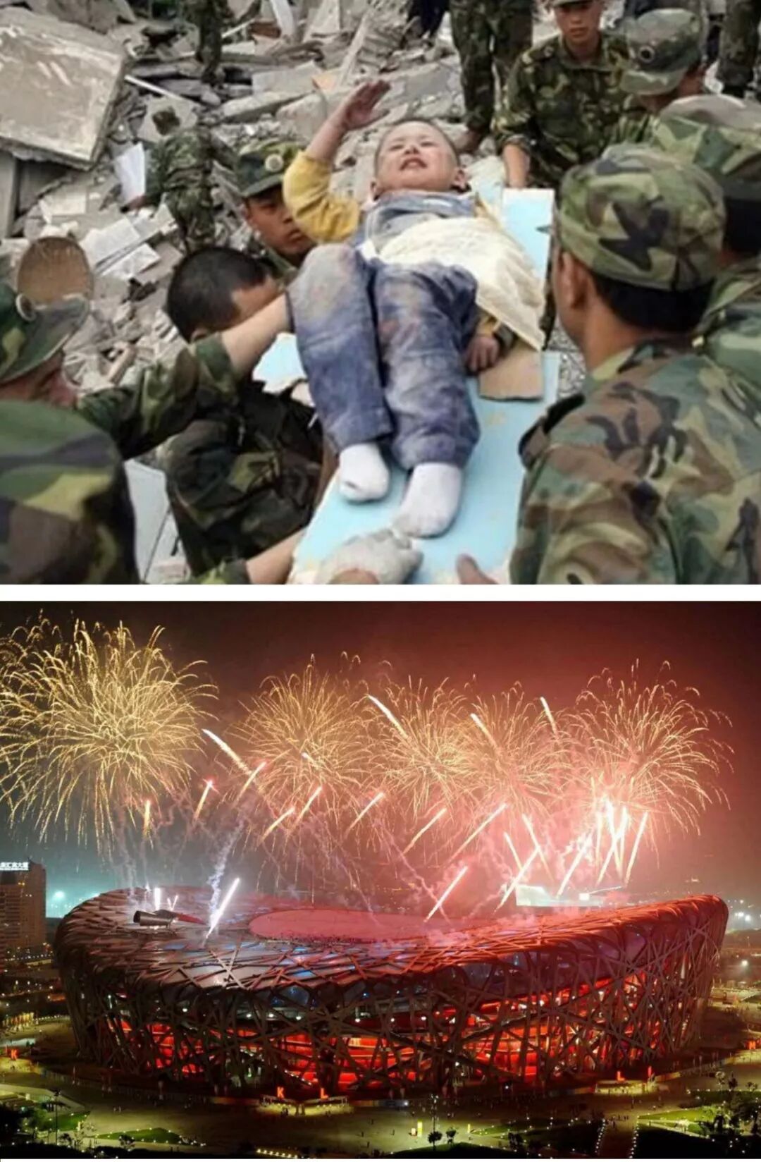 2008年5月12日,四川省汶川县发生里氏8.0级地震,是新中国成立以来破坏力最大的地震。上图为从废墟中营救出来的儿童向解放军叔叔敬礼表示感谢。同年8月8日,北京奥运会开幕。