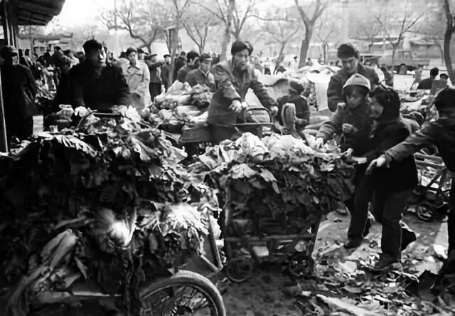 1984年,北京街头购买冬储大白菜的热闹场面。(新华社)