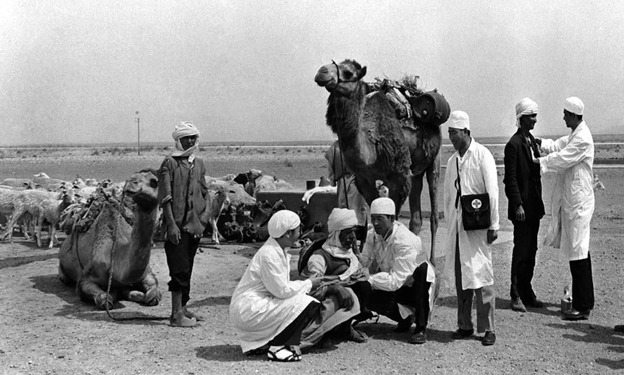 1969年,中国医疗队的医务人员在阿尔及利亚的撒哈拉沙漠牧区为牧民看病。自1963年向非洲派出第一支医疗队之后的6年间,中国已向47个非洲国家和地区派出了1.6万名医务工作者,救助非洲民众2.4亿人次。