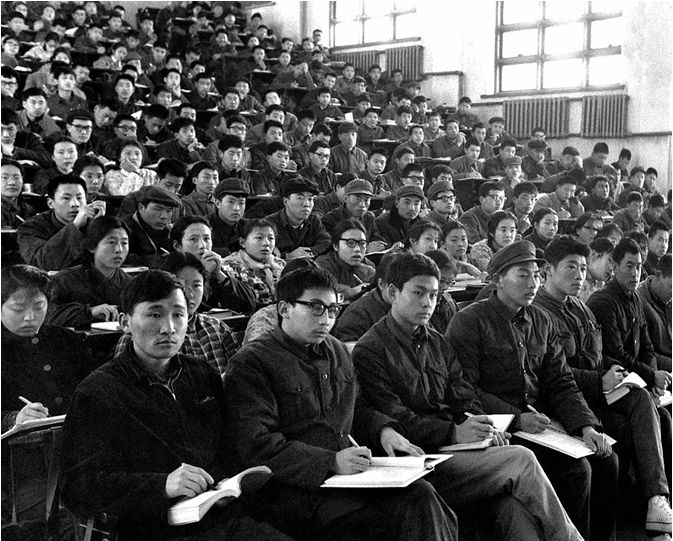 1977年9月,教育部在北京召开全国高等学校招生工作会议,决定恢复已经停止了10年的全国高等院校招生考试。图为清华大学恢复高考后的第一批大学生在课堂上学习。