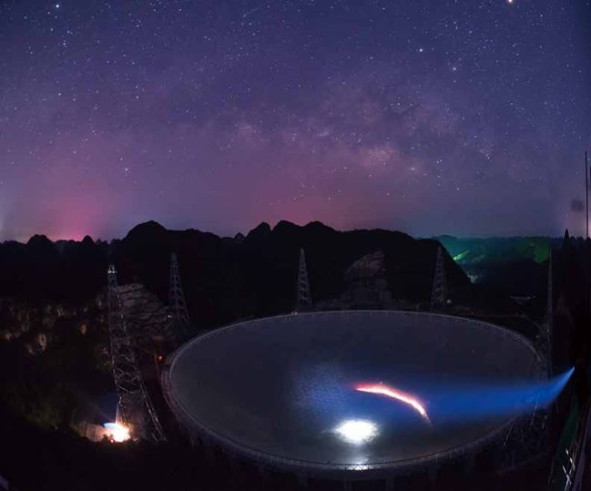 2016年9月25日,具有我国自主知识产权的世界最大单口径巨型射电望远镜——500米口径球面射电望远镜(FAST)在贵州平塘落成启动。图为6月27日,FAST在满天繁星下呈现出的美丽景观。