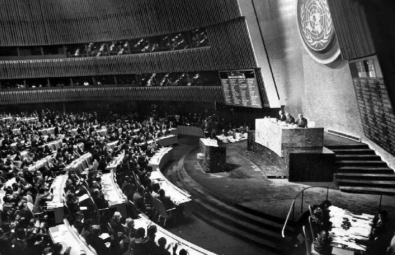 1971年10月25日,第26届联合国大会恢复了中华人民共和国在联合国的一切合法权利。图为大会召开时的情景。(新华网)