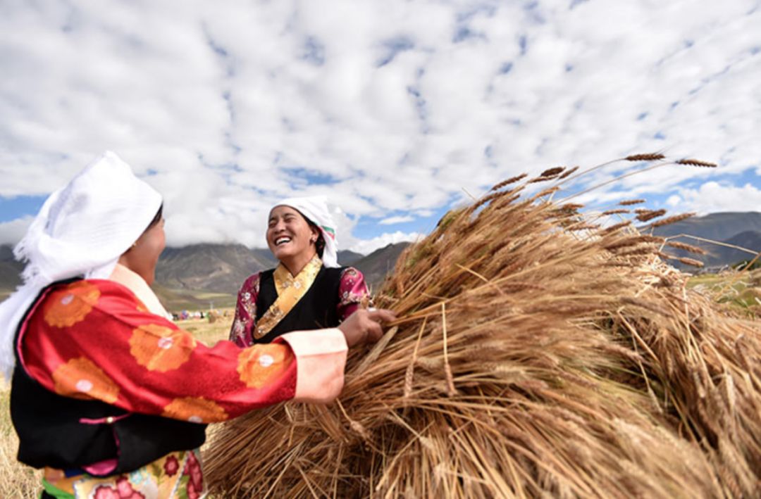 经党中央批准、国务院批复,自2018年起,将每年农历秋分设立为中国农民丰收节,这是第一个在国家层面为农民设立的节日,进一步彰显了“三农”工作重中之重的基础地位。图为2018年9月23日,首个中国农民丰收节,拉萨市林周县松盘乡松盘村两名藏族农民在田间聊天。(新华社/觉果)