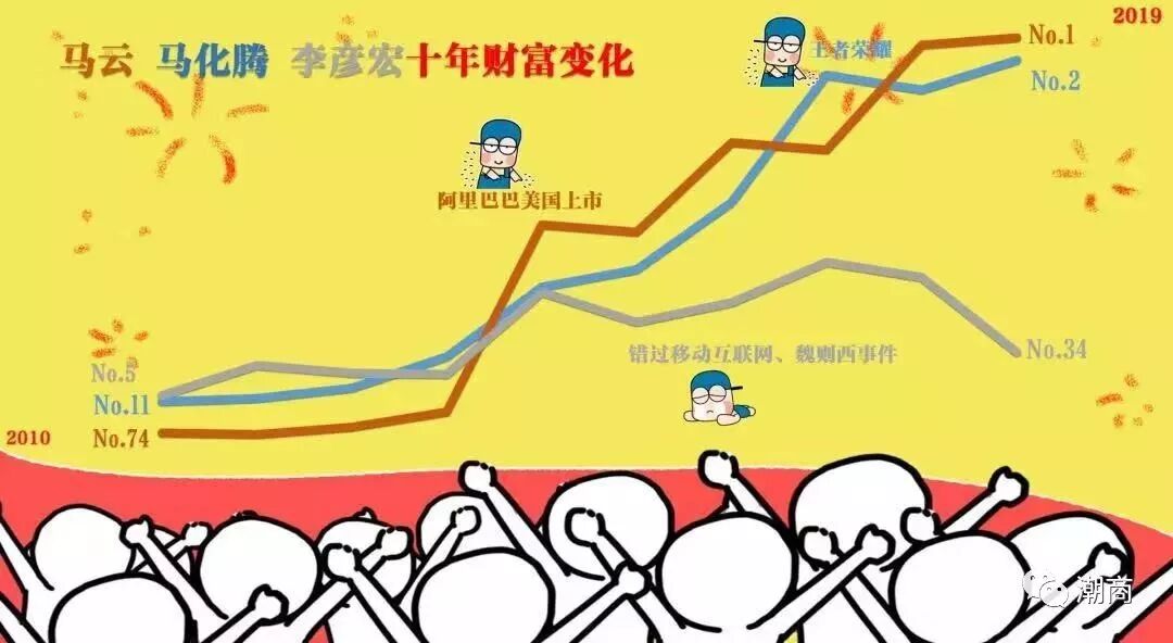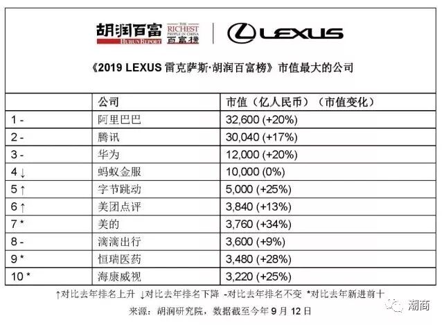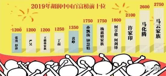 提示:点击上方"潮商"关注我们 10月10日,2019胡润百富榜揭晓,马云家族以2750亿元位列第一;马化腾财富上涨200亿,以2600亿元重返第二;许家印财富缩水400亿,以2100亿退居第三。对此,胡润表示:“今年就一个‘老马’、一个‘小马’,‘二马当先’。” 此外,何享健、何剑锋,杨惠妍家族,孙飘扬、钟慧娟,黄峥,丁磊,王健林家族,严昊,张勇、舒萍进入前十。 ![]() 今年的榜单有两个变化十分显著。第一,百富榜的上榜人数连续两年下滑,从去年到现在,近四成企业家落榜。第二,今年榜单上有19位富豪的财富上了千亿,比去年增加了7人,是历年最多的一次。前50名的门槛提高了100亿至510亿,富豪们的平均财富达98个亿,而15年前,中国首富才只有100个亿。