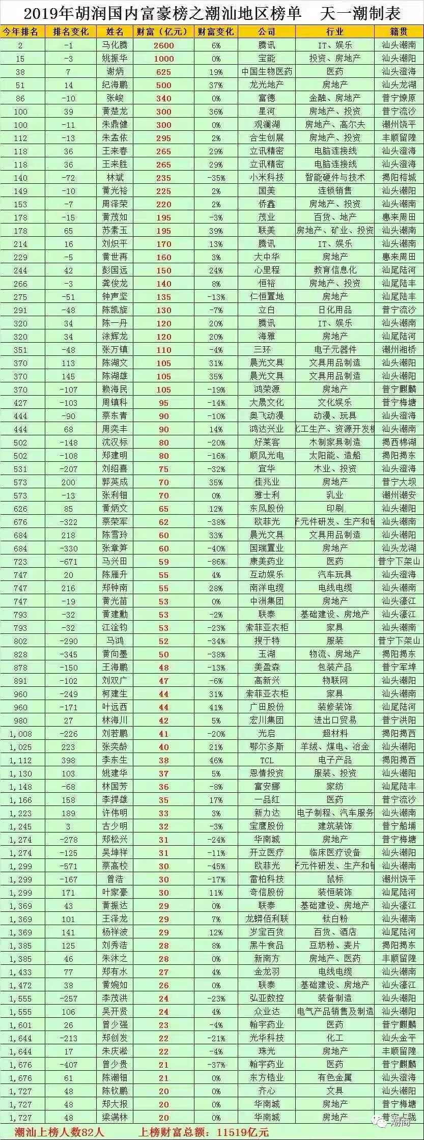 提示:点击上方"潮商"关注我们 10月10日,胡润研究院发布《2019胡润百富榜》。在国内前一百名名单中,共有7位潮汕企业家上榜,他们分别是排名第2的马化腾,排名第15的姚振华,排名第38的谢炳,排名第51的纪海鹏,排名第86的张峻,排名并列第100的黄楚龙、朱鼎健。