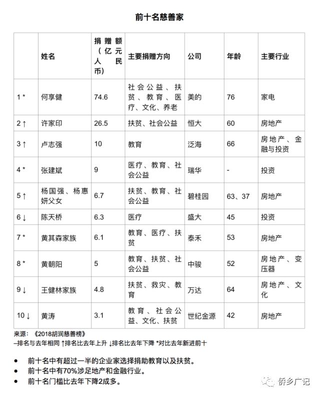 提示:点击上方"潮商"关注我们 5月8日,胡润研究院发布《2018胡润慈善榜》,共有100名中国大陆最慷慨的慈善家上榜,总捐赠额比去年上升28%,达到210亿元。其中,美的创始人、76岁的何享健以75亿元捐赠额成为中国首善。据悉,今年是胡润研究院连续第十五年发布胡润慈善榜。 总捐赠额达210亿元 粤商人数居首 根据榜单,100名中国大陆最慷慨的慈善家总捐赠额比去年上升28%,达到210亿元;上榜门槛比去年提高6.7%,达到1600万元。对此,胡润表示:“捐赠额上升明显,平均捐赠额是15年前我们第一张慈善榜的平均捐赠额的十多倍。” 其中,美的创始人、76岁的何享健以75亿元捐赠额成为中国首善,也是历年来第四位单笔捐赠过10亿美元的慈善家,其捐赠资金主要用以支持精准扶贫、教育、医疗、养老、创新创业、文化传承等多个领域的公益事业。胡润研究院表示,他的“慈善信托+基金会”的模式,对推动中国大额捐赠的落地和私人基金会的可持续发展有示范和标杆的作用。 何享健 许家印捐赠26.5亿元排名第二,主要包括精准扶贫贵州省毕节市,目前第四笔捐赠20亿元到账,以及以集团名义在广东扶贫日认捐4亿元等;卢志强捐赠10亿元排名第三,主要以集团名义捐赠8亿元,扩大“泛海助学行动”等。 另外,根据记者统计,本次榜单中粤商比去年增加4人,以21人稳居第一。浙商以14人重回前三排名第二,去年并列第一的闽商比去年骤减6人,以11人排名第三。同时,广东比去年增加3人,仍然是最多慈善家设立公司总部的地区,有28人上榜;北京比去年增加3人,以19人保持第二;上海比去年增加2人,以12人保持第三。 教育领域捐赠人数最多 医疗领域颇受关注 从捐赠领域来看,教育领域的捐赠人数仍然最多,占榜单的41%,比去年减少3个百分点;扶贫方面再增1个百分点,以18%排名第二;捐赠慈善基金会等社会公益方面比去年减少2个百分点,以18%并列第二;医疗方面比去年剧增9个百分点,以13%排名第四。 对此,胡润百富董事长兼首席调研员胡润表示:“随着捐赠数额的提高,从事慈善的经验逐渐丰富,我们看到医疗、大健康领域的捐赠有了明显的增加,但这十五年来,教育基本上一直都是中国企业家最热衷的捐赠方向,尤其是给母校捐赠,除非有重大灾难发生而捐向赈灾领域。” 教育是企业家最热衷捐赠的方向。 随着社会对医疗健康关注度的持续上升,记者了解到,部分企业家在医疗健康领域的捐助开始走向国际化。例如康美药业马兴田、许冬瑾夫妇向瑞典卡罗琳斯卡大学、乌普萨拉大学捐赠8亿元用于成立中医药科研基地。盛大陈天桥则专注全球脑科学慈善研究,今年捐赠8500万美元设立上海陈天桥国际脑疾病研究所等。万利加的李伟波以基金会名义向美国麻省大学医学院捐赠1000万美元,用于建立李伟波罕见病研究中心。 文化的境界 · 财富的智慧