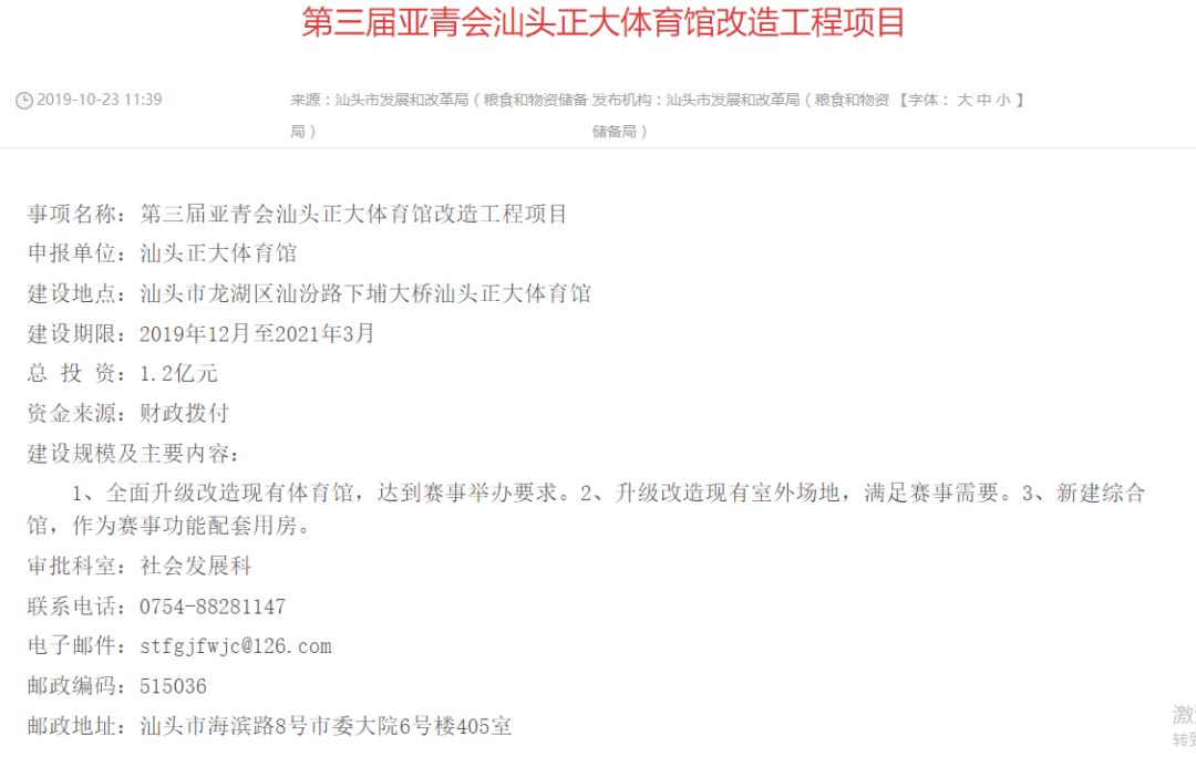 提示:点击上方"潮商"关注我们 据汕头市发展和改革局消息,第三届亚青会汕头正大体育馆改造工程项目正在进行投资公示。