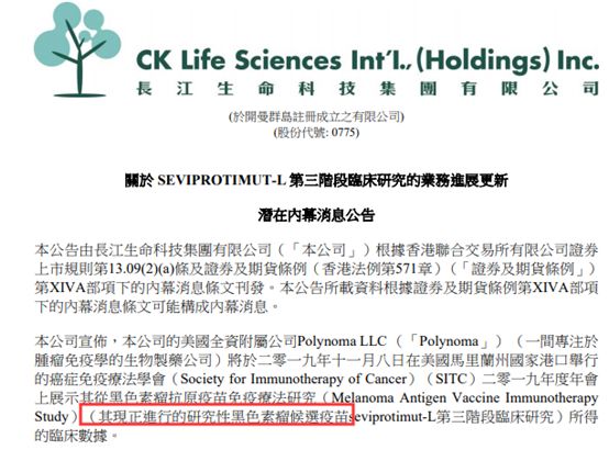 公司还表示,研发黑色素瘤疫苗的美国全资附属公司Polynoma LLC (Polynoma) 将于2019年11月8日在美国马里兰州国家港口举行的癌症免疫疗法学会(SITC)2019年度年会上展示其从黑色素瘤抗原疫苗免疫疗法研究所得的临床数据。
