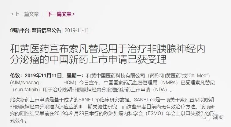 除了捐钱,李嘉诚还有重磅动作。伦敦时间11月11日,李嘉诚旗下和黄中国医药科技有限公司(简称“和黄医药”或“Chi-Med”)宣布,中国国家药品监督管理局(NMPA)已受理索凡替尼(surufatinib)用于治疗晚期非胰腺神经内分泌瘤的新药上市申请(NDA)。索凡替尼是继爱优特®(用于结直肠癌治疗的呋喹替尼胶囊)去年在中国成功推出市场后,和黄医药第二款自主研发并在中国提交新药上市申请的创新肿瘤药物。 ![]() 据悉,此次新药上市申请是基于成功的SANET-ep临床研究数据。SANET-ep是一项关于索凡替尼以晚期非胰腺神经内分泌瘤为适应症的III 期关键性研究,而这些患者目前尚无有效治疗方法。该项研究的阳性结果早前在2019年9月29日举行的欧洲肿瘤内科学会(ESMO)年会上以口头报告的形式公布。 资料显示,索凡替尼(surufatinib,亦称HMPL-012或sulfatinib)是由和黄医药自主研发的一种新型的口服酪氨酸激酶抑制剂,具有抗血管生成和免疫调节双重活性。索凡替尼可通过抑制血管内皮生长因子受体(VEGFR)和成纤维细胞生长因子受体(FGFR)以阻断肿瘤血管生成,并可抑制集落刺激因子-1受体(CSF-1R),通过调节肿瘤相关巨噬细胞,促进机体对肿瘤细胞的免疫应答。因为具有抗肿瘤血管生成和免疫调节的双重机制,索凡替尼可能非常适合与其他免疫疗法联合使用。 和黄医药首席执行官贺隽(Christian Hogg)表示:“提交新药上市申请意味着索凡替尼有望在中国获批及上市,为治疗方法选择非常有限的众多患者带来一种新的治疗选择。为了尽可能在让索凡替尼在获批后惠及更多患者,我们目前正在组建我们自己的肿瘤药物商业化团队,并期望在索凡替尼上市之时便准备就绪,覆盖中国所有相关的医院及诊所。” “我们相信,索凡替尼凭借其可靠的疗效、良好的耐受性、联合用药的可能性,以及抗血管生成-免疫调节的双重活性抑制剂的特性,将成为中国市场上极具吸引力的疗法。”贺隽补充道。 和黄医药现时拥有索凡替尼在全球范围内的所有权利。索凡替尼正在中国、美国及欧洲作为单药治疗或与其他肿瘤免疫疗法联合治疗开展针对多种实体瘤的研究。 9月30日和黄医药曾宣布,其股东长江和记已为通过承销公开发售方式,出售和黄医药约1.3%全部已发行股本定价,集团在和黄医药的持股量将由51.5%降至49.9%。长江和记计划保留集团在和黄医药的股权,作为一项长远投资,继续支持该公司致力发展成为一家环球生物制药公司。 来源:证券时报、凤凰财经等 声明:本文不代表我们的观点,仅供读者参考。文章版权归原作者所有,如有侵权,请联系我们进行删除。 潮 商 文化的境界 · 财富的智慧