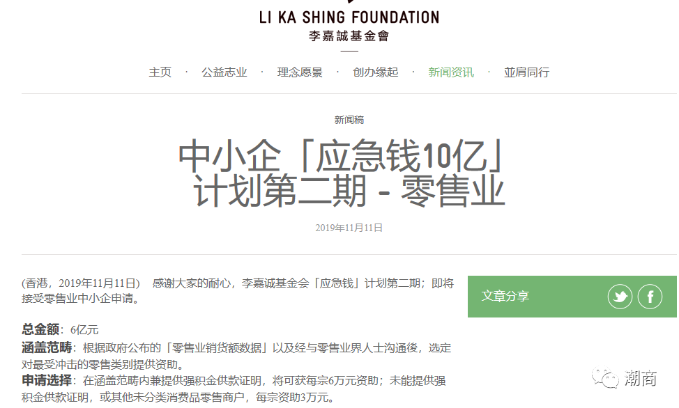 提示:点击上方"潮商"关注我们 今年“双11”,就在全国人民熬夜剁手的时候,李嘉诚做了两件大事: 一件是出手6亿港元力撑日益艰难的香港零售业; 二是宣布,中国国家药品监督管理局(NMPA)已受理索凡替尼(surufatinib)用于治疗晚期非胰腺神经内分泌瘤的新药上市申请(NDA)。 前者救助中小企业于水火,后者给病患带来福音。来了解一下具体情况—— 11月11日,李嘉诚基金会发布公告,表示将发放6亿港元支援零售行业的中小企业。每个符合资格的实体零售商铺可获得3万或6万港元的资助,于11月18日开始接受申请,12月中之前开始发放。这一举措是李嘉诚基金会早前宣布的“应急钱10亿”计划中的第二期。 ![]() 此前,李嘉诚基金会于10月29日宣布将动用2亿港元支持餐饮行业,凡合资格的中小餐厅每间可获6万港元资助,这笔款项于11月8日开始接受网上申请。 根据香港特区政府公布的零售业销货额数据,经与零售业界人士沟通後,李嘉诚基金会选定对最受冲击的5大零售类别提供资助。范围涵盖衣物、鞋类及有关制品,电器及其他未分类耐用消费品,书报、文具及礼品,及中药、药物、化妆品。 ![]() 图源:视觉中国 香港政府统计处此前曾公布,今年9月份香港零售总销货价值按年跌18.3%至299亿港元,按年比较,上述五大零售类别依次跌21.7%、18.2%、16.6%、9.6%及1.4%。