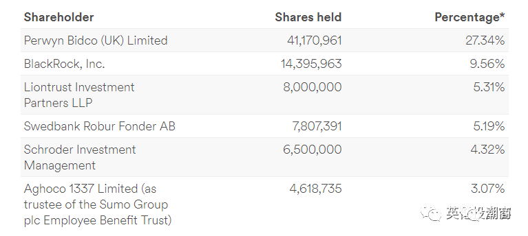 从Sumo Group的各大股东信息来看,腾讯通过此次投资获得9.96%持股后,将力压美国私募股权基金贝莱德(Blackrock),成为Sumo Group的第二大股东。