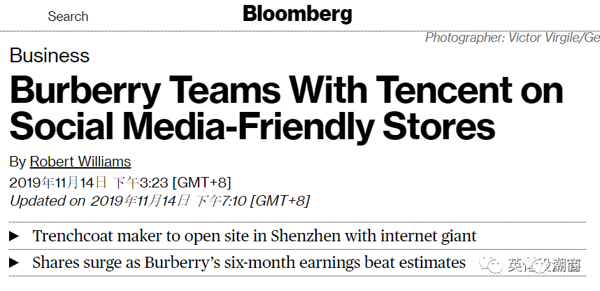 就在腾讯收购英国上市游戏公司的同一时间,英国奢侈品巨头巴宝莉(Burberry)于11月14日宣布,将会与腾讯建立独家合作。