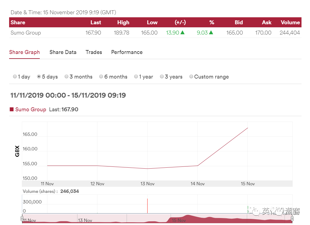 虽然腾讯收购的股份数量已经曝光,但Sumo Group并没有对外公布交易价格。但如果根据Sumo Group昨晚154便士的收市价计算,腾讯收购Sumo Group1500万股的价值约为2310万英镑(约合人民币2.08亿)。 值得注意的是,Sumo Group在宣布这一投资消息后,其股票在今天早盘交易中从每股154便士一度猛涨到189便士,但最终回落到每股167便士,日涨幅为9.03%。