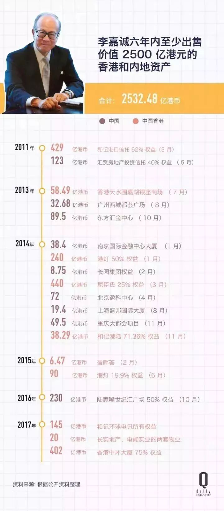 图片来源:好奇心日报 实际上,在李嘉诚进入耄耋之年后,李泽钜对李家这个庞大商业帝国的影响越来越明显。 如果说长实与和黄是由李嘉诚打下的天下,长江集团旗下第三大上市公司长江基建则更似李泽钜的“毕业作”。1996年,李泽钜负责分拆长江基建上市,获得超额认购25倍的功绩。在长江基建上市后,李嘉诚曾表示,李泽钜的表现可得90多分,“如果他不是我的孩子,更会给他100分!” 近年来,由李泽钜掌勺的长江基建成为李嘉诚商业王国向外扩张的主力军。从1999年开始,长江基建与香港电灯合作,以34亿澳元投得南澳洲ETSA电网权益,是长江基建业务国际化踏出的第一步。 2003年,李泽钜被《时代》杂志评为“年度全球商界最具影响力人物”之一。在他的带领下,长江基建也多次与香港电灯,即电能实业有限公司的前身,携手收购海外资产,从2000年至今斥资逾2000亿港元海外收购了11项英国、加拿大和澳大利亚等国的基建项目,涉及电力、水务、天然气供应等项目。2010年10月,长江基建以700亿港元作价收购英国电网而后又以588亿港元作价收购供水网络NorthumbrianWater,按照英国媒体的说法,李泽钜几乎已经“买下了英国”。 2012年,李泽钜正式掌控市值逾8500亿港元的产业,账面身家资产超过李嘉诚。 拥有加拿大国籍的李泽钜,没有任何中国内地生活经验。有评价认为,他的这一特点,影响到了李家产业和投资的布局,是近些年李家钟情海外投资,减持甚至抛售内地和香港物业的重要原因之一。 除上述影响外,在外界及其内部员工看来,相比李嘉诚,李泽钜行事刻板、谨慎,甚至有些“计到尽”(算计至极)的感觉。但在李嘉诚心中,对这个儿子的评价几乎是完美的。 从很大程度上而言,长和系正在进入李泽钜时代。他对整个家族产业的影响也在一定程度上正在超越李嘉诚。李泽钜的个性和人生经历正在替代李嘉诚影响到李家整个商业帝国。 下面我们用一张图来看看继承者李泽钜的成长历程: