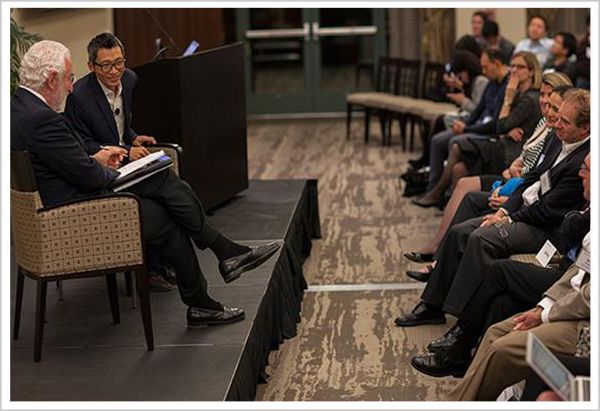 里面的人群众星拱月般安静地围绕讲台坐着,他们的身份分别是学者、教授、硅谷领袖。大部分人摊开了笔记本和电脑,都在认真倾听和记录这场中、美两位学者间的重磅对话。