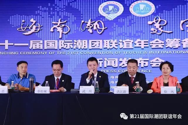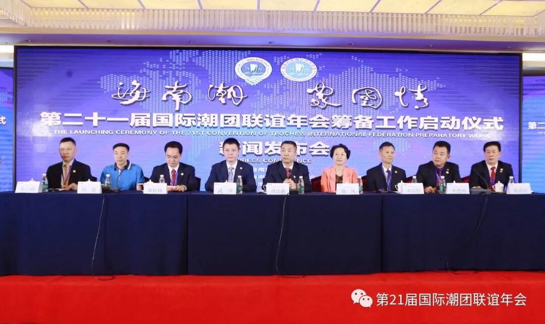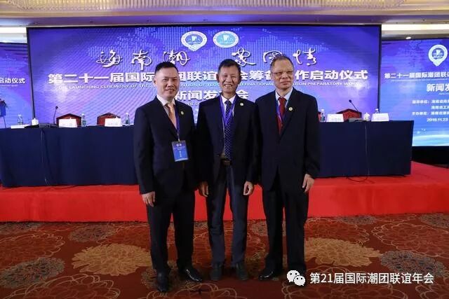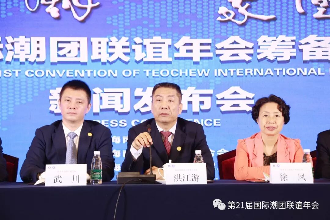 11月23日上午,国际潮团总会第二十一届国际潮团联谊年会筹备工作启动仪式新闻发布会在海南迎宾馆成功召开。此次发布会主题为“海南潮 家国情——第二十一届国际潮团联谊年会筹备工作启动仪式”,由海南省商务厅、海南省工商业联合会(总商会)指导,海南省潮商经济促进会(简称海南潮促会)主办。第二十一届国际潮团联谊年会筹备委员会副秘书长王紫丹主持会议。 出席本次新闻发布会的有:海南省商务厅副厅长武川、海南省工商联专职副主席徐凤、海南省委统战部非公有制经济工作处调研员刘恩、海南省工商联商会协会处处长陈贤敏 、海南国际经济发展局副局长姬国辉、海南省工信厅招商处处长陈丹虹、国际潮团总会理事会主席、海南潮促会会长、康芝药业股份有限公司董事长洪江游以及潮籍老干部陈英豪、詹益耀、田启宗、杜汉文,三亚市潮汕商会、海南省汕尾商会、海南省潮青会、海南省自由贸易区跨境贸易商会、东方市潮汕经济文化联合会、琼中潮汕商会、海南省广东商会、海南省南京商会等领导、企业家、商协会代表、新闻媒体记者共一百多人出席见证。 第二十一届国际潮团联谊年会名誉主席陈省来、第二十一届国际潮团联谊年会筹委会(简称筹委会)常务执行主席、海南潮促会执行会长、海南禹成节能阀门制造有限公司总经理蔡松城,筹委会执行主席、海南潮促会监事长、海南南国食品实业有限公司董事长刘汉惜,筹委会执行主席、海南潮促会执行会长、海南佳宁娜食品有限公司董事长李楚炯,海南长丰实业开发公司董事长张立峰、乐东茂隆农业开发有限公司总经理陈树远、海口联合展发贸易有限公司总经理张玉宽、海南新邦贸易有限公司董事长黄武波,筹委会执行主席兼秘书长、海南潮促会执行会长、海南扬帆国际旅行社有限公司董事长邱国庆,第二十一届国际潮团联谊年会常务副主席何奕鹏、国际潮团总会深圳代表处张丽如等出席。