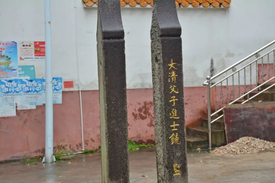 如果你看得仔细一点,会发现牌坊前左右两侧分别有两块旗杆夹石,分别写着“大明父子进士饶”和“大清父子进士饶”,这又是怎么回事呢?