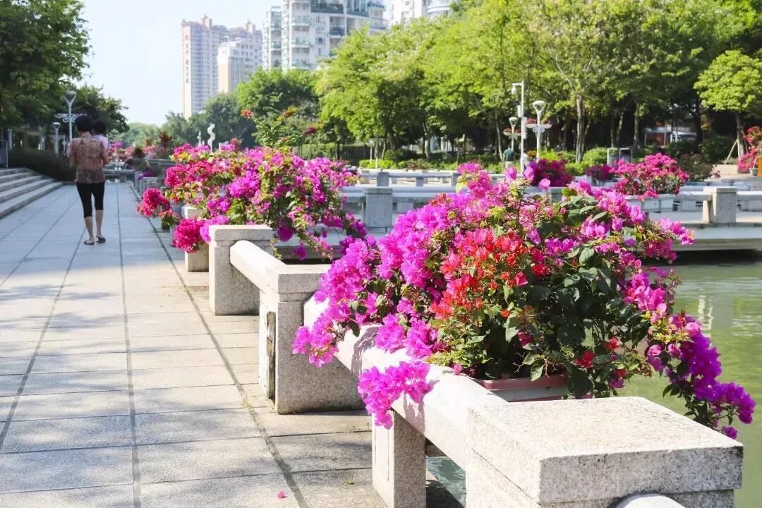 一棵棵、一簇簇、一丛丛,三角梅的盛情绽放,把星湖公园点缀得姹紫嫣红、花团锦簇、“春意”盎然。三角梅是一种很有热带风情的植物,花期很长,从春末一直开到初冬,绵延着温暖的光辉。三角梅,“三瓣就是一朵花”的清雅素描,热情地将一池湖水渲染得温馨而富有情趣。