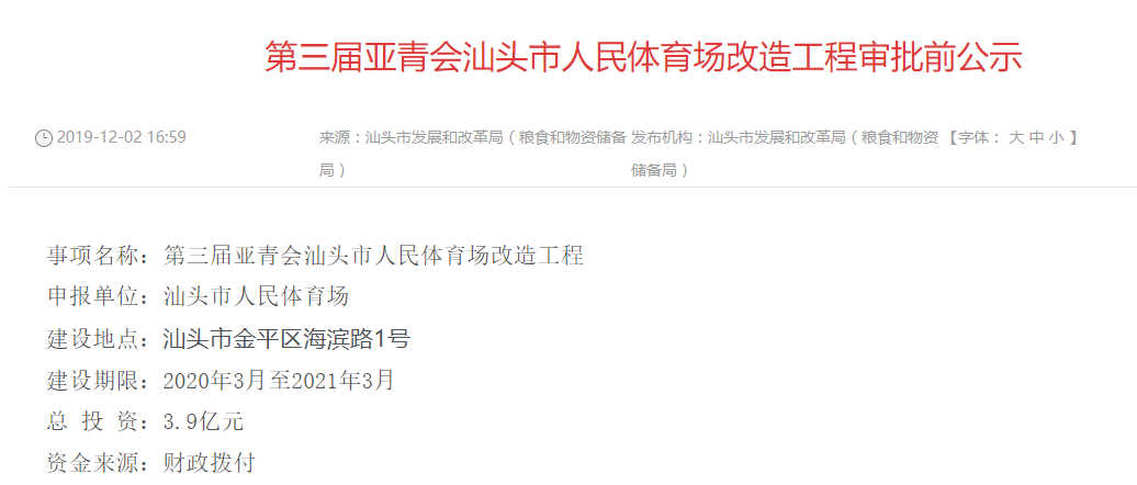►在汕头市人民体育场(田径场),将拆除并新建汕头市人民体育场(田径场),达到举办赛事要求;并新建地下车库,作为赛事功能配套用房、停车库、设备房等。 ►在汕头市人民体育场(体育馆),将升级改造潮汕体育馆,达到赛事举办要求;拆除综合训练馆及游泳池;升级改造室外场地,配套赛事需求。 ►在中国游泳协会汕头跳水学校老校区,将拆除原陆上训练馆,新建跳水博物馆及训练馆,满足赛前训练需求兼文化活动需求;升级改造室外场地,作跳水纪念公园。 ►在体育场周边,将拆除体育场北侧的建筑、拆除旧体育局办公楼,升级改造室外场地,作城市绿地公园。 第三届亚青会汕头市游泳跳水馆改建项目(汕头体育运动学校)建设地点位于汕头市濠江区南滨路中段。建设期限为2020年1月至2021年3月,总投资11.4亿元,为财政拨付。