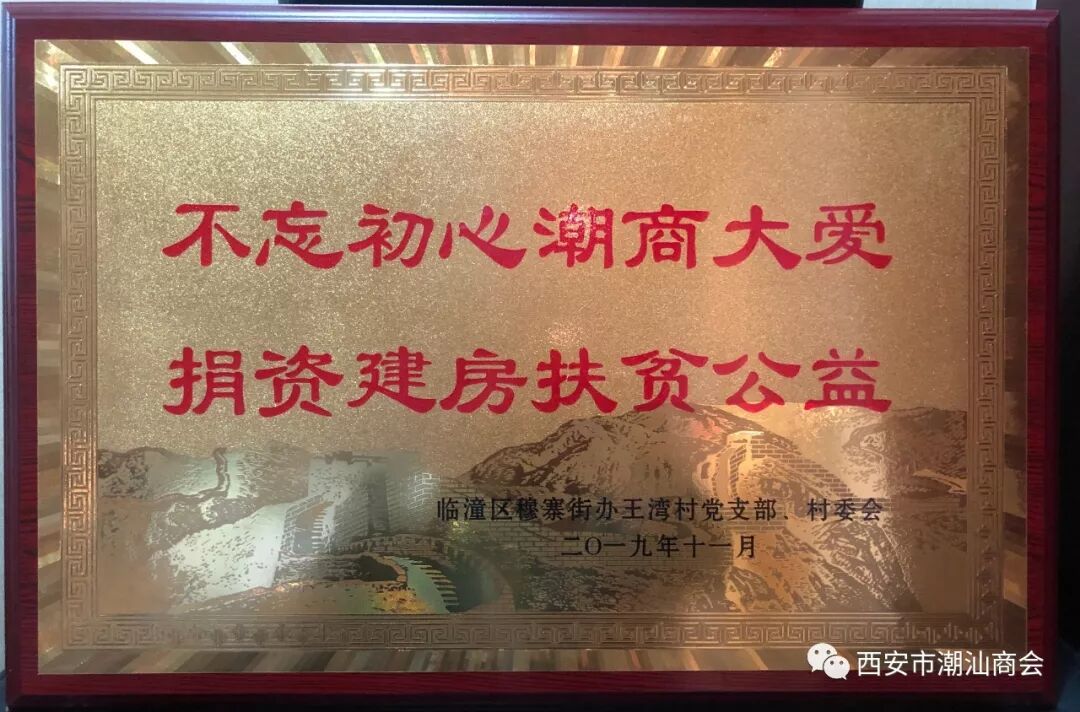 2019年12月5日上午,西安市潮汕商会执行会长郑卓生、党支部书记、秘书长吴培坤、支部委员、副秘书长佘绍川、副秘书长杨悦珍在西安市民政局副局长朱友民、社会组织党委书记、社会组织管理局曹立宏局长的陪同下,专程前往临潼区穆寨街办王湾村参加“精准扶贫”活动,代表商会捐赠给该村村民、贫困户姚文计建造房屋善款五万元。