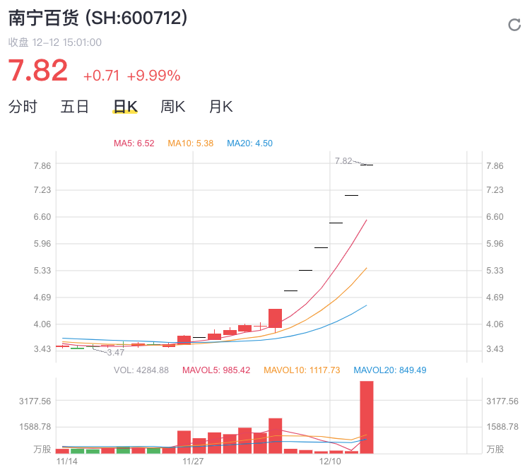 近一年多来,国资入股民资几乎成为主流,“野蛮人”姚振华却反其道而行之。 1 12月12日,南宁百货开盘再度涨停,录得7连板。目前股价为7.82元,总市值42.59亿元。 为啥连续涨停?因为那个在“万宝之争”中名震江湖的姚振华又回来了。