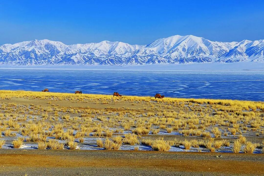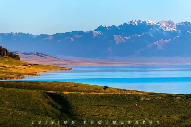 赛里木湖背靠雪山,终年不化,银装素裹。湖水碧蓝,湖边是广阔草原,牧马奔驰,牛驼踱步,静谧、温馨、粗犷深远、如诗如画……